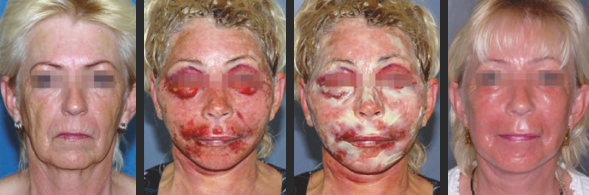 Б — Послеоперационный период, ситуация через 3 дня после вмешательства: хирургическая подтяжка лица и лазерная шлифовка кожи CO2-лазером. В периорбитальной и периоральной областях, обработанных лазером, наблюдаются более глубокие поражения