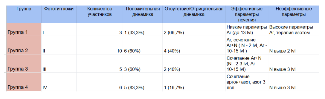 - перекрестный анализ данных всех участников исследования каждый месяц с учетом оценки визуальных изменений состояния кожи, реакции на аргоновую и азотную плазму, уровни мощности (температурный режим), динамики воспалительных процессов и пигментации